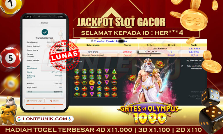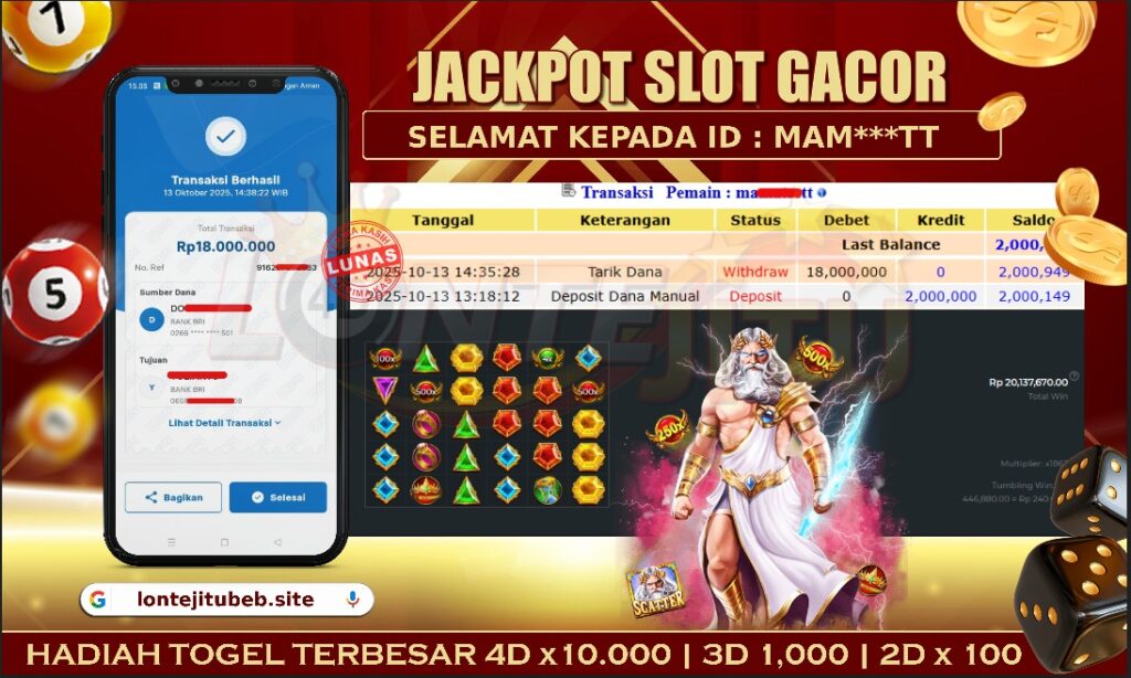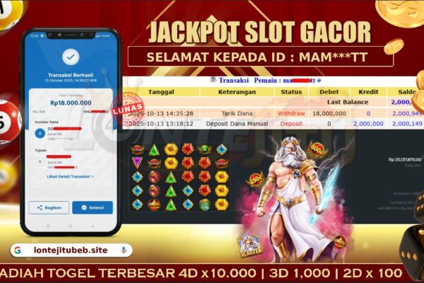 Bukti JP SLOT GATES OF OLYMPUS – Kami mengucapkan selamat kepada bossku Username ID MAM***TT atas kemenangan di permainan SLOT GATES OF OLYMPUS SUPER dengan total kemenangan sebesar Rp.18,000.000,00,- Kemenangan ini yang pastinya sudah dibayar LUNAS sesuai dengan bukti ya bossku. Lontejitu nih boss, berapapun kemenangan anda akan tetap kami bayar sampai tuntas ya boss. Disini…
