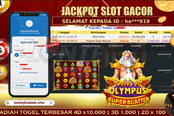 Bukti JP SLOT GATES OF OLYMPUS SUPER SCATTER – Kami mengucapkan selamat kepada bossku Username ID HE***919 atas kemenangan di permainan SLOT GATES OF OLYMPUS SUPER SCATTER dengan total kemenangan sebesar Rp.23,000.000,00,- Kemenangan ini yang pastinya sudah dibayar LUNAS sesuai dengan bukti ya bossku. Lontejitu nih boss, berapapun kemenangan anda akan tetap kami bayar sampai tuntas ya…