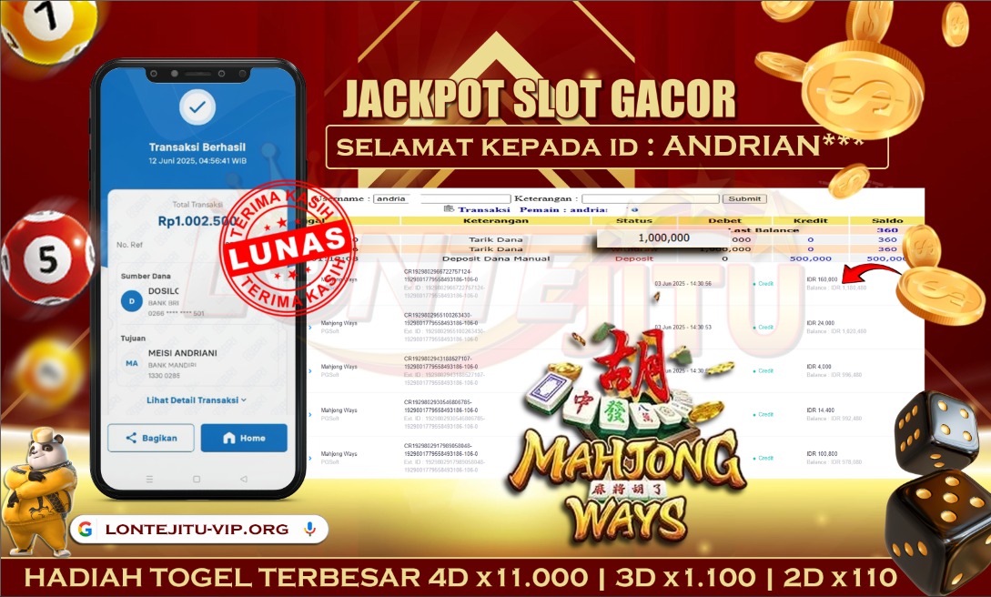 Bukti JP SLOT MAHJONG WAYS – Kami mengucapkan selamat kepada bossku Username ID ANDRIAN*** atas kemenangan di permainan SLOT MAHJONG WAYS dengan total kemenangan sebesar Rp.1,000.000,00,- Kemenangan ini yang pastinya sudah dibayar LUNAS sesuai dengan bukti ya bossku. Lontejitu nih boss, berapapun kemenangan anda akan tetap kami bayar sampai tuntas ya boss.