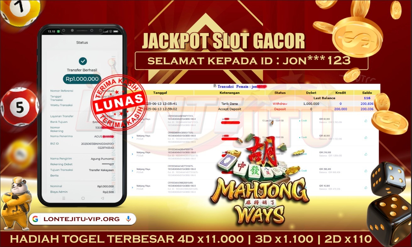 Bukti JP SLOT MAHJONG WAYS – Kami mengucapkan selamat kepada bossku Username ID JON***123 atas kemenangan di permainan SLOT MAHJONG WAYS dengan total kemenangan sebesar Rp.1,000.000,00,- Kemenangan ini yang pastinya sudah dibayar LUNAS sesuai dengan bukti ya bossku. Lontejitu nih boss, berapapun kemenangan anda akan tetap kami bayar sampai tuntas ya boss.