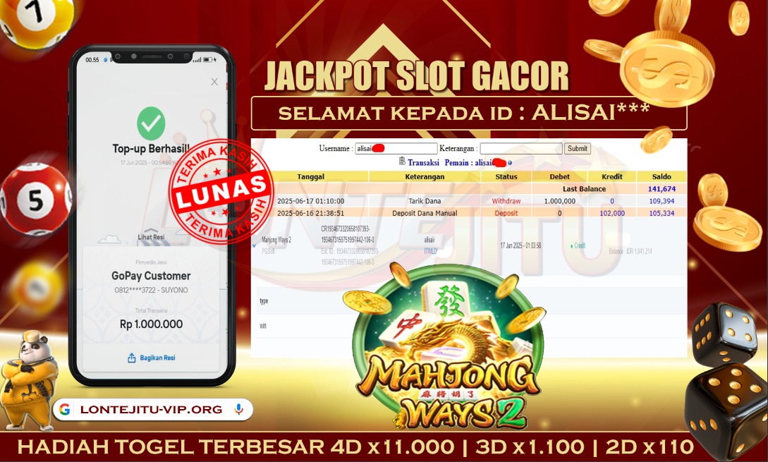 Bukti JP SLOT MAHJONG WAYS – Kami mengucapkan selamat kepada bossku Username ID ALISAI*** atas kemenangan di permainan SLOT MAHJONG WAYS dengan total kemenangan sebesar Rp.1,000.000,00,- Kemenangan ini yang pastinya sudah dibayar LUNAS sesuai dengan bukti ya bossku. Lontejitu nih boss, berapapun kemenangan anda akan tetap kami bayar sampai tuntas ya boss.