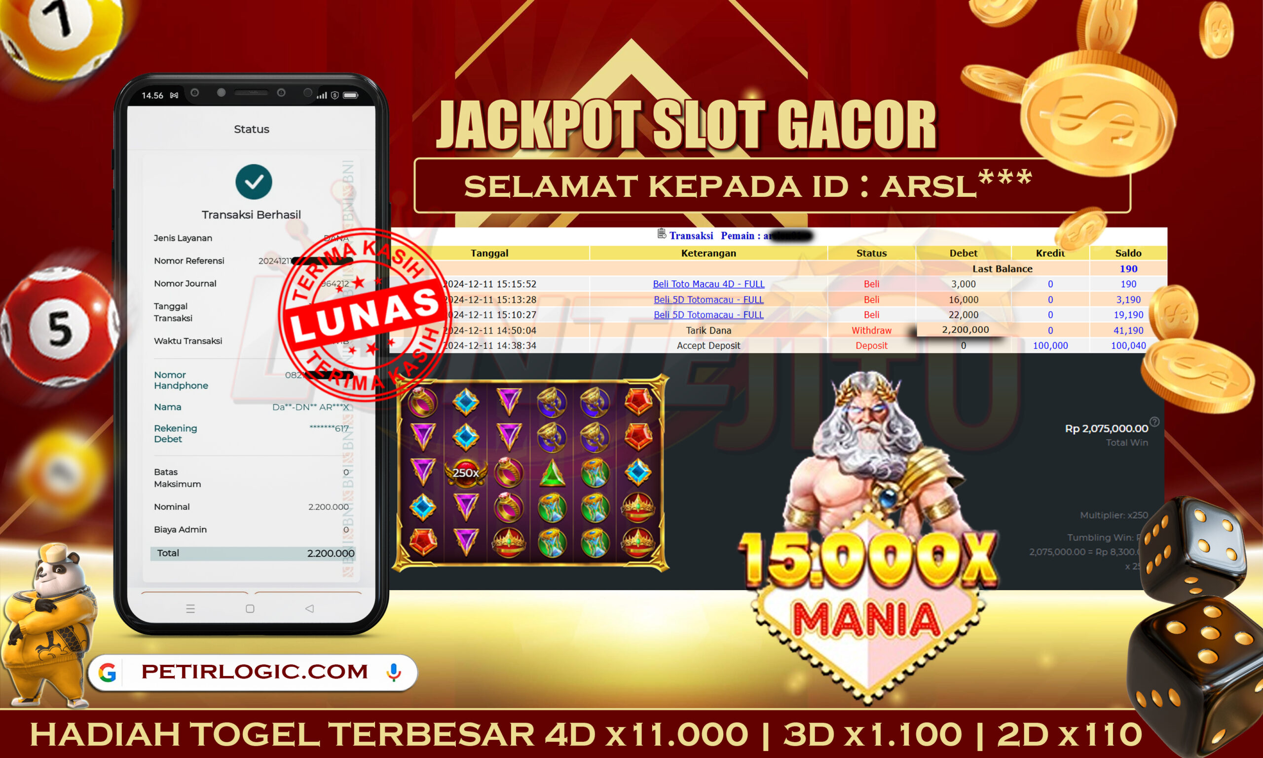 Bukti JP SLOT 15.000X MANIA – Kami mengucapkan selamat kepada bossku Username ID ARSL*** atas kemenangan di permainan SLOT 15.000X MANIA dengan total kemenangan sebesar Rp. 2.200.000,00,- Kemenangan ini yang pastinya sudah dibayar LUNAS sesuai dengan bukti ya bossku. Lontejitu nih boss, berapapun kemenangan anda akan tetap kami bayar sampai tuntas ya boss.