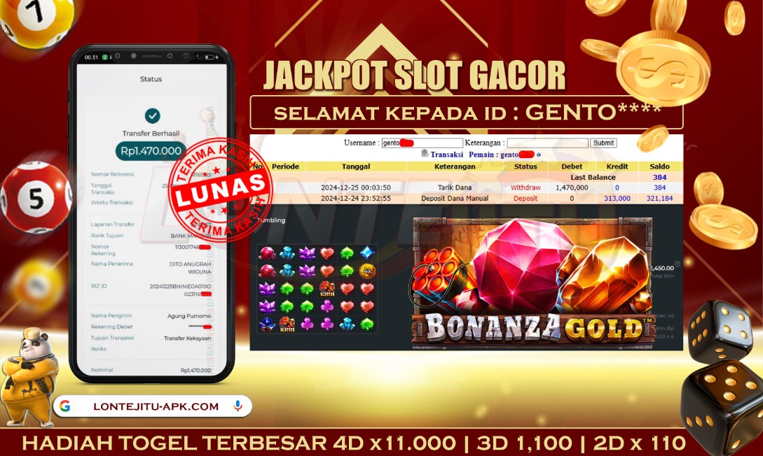 Bukti JP SLOT BONANZA GOLD– Kami mengucapkan selamat kepada bossku Username ID GENTO**** atas kemenangan di permainan SLOT BONANZA GOLD dengan total kemenangan sebesar Rp.1, 470.000,00,- Kemenangan ini yang pastinya sudah dibayar LUNAS sesuai dengan bukti ya bossku. Lontejitu nih boss, berapapun kemenangan anda akan tetap kami bayar sampai tuntas ya boss.