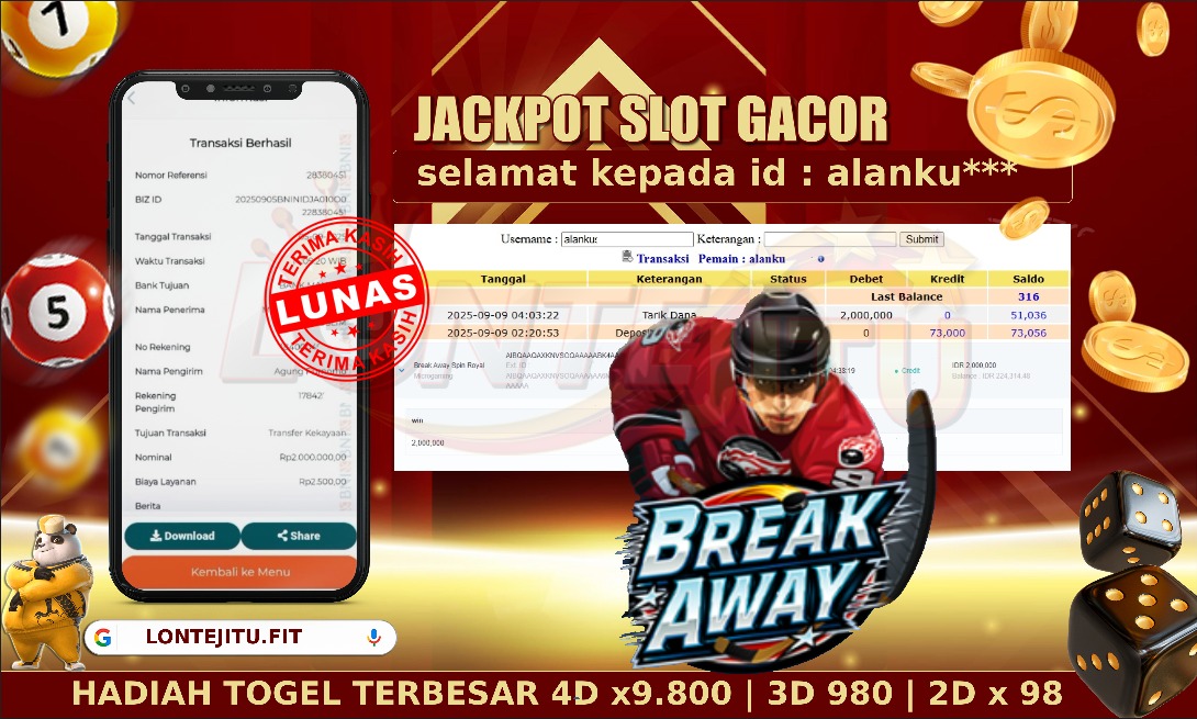 Bukti JP SLOT BREAK AWAY – Kami mengucapkan selamat kepada bossku Username ID ALANKU*** atas kemenangan di permainan SLOT BREAK AWAY dengan total kemenangan sebesar Rp.2,000.000,00,- Kemenangan ini yang pastinya sudah dibayar LUNAS sesuai dengan bukti ya bossku. Lontejitu nih boss, berapapun kemenangan anda akan tetap kami bayar sampai tuntas ya boss.