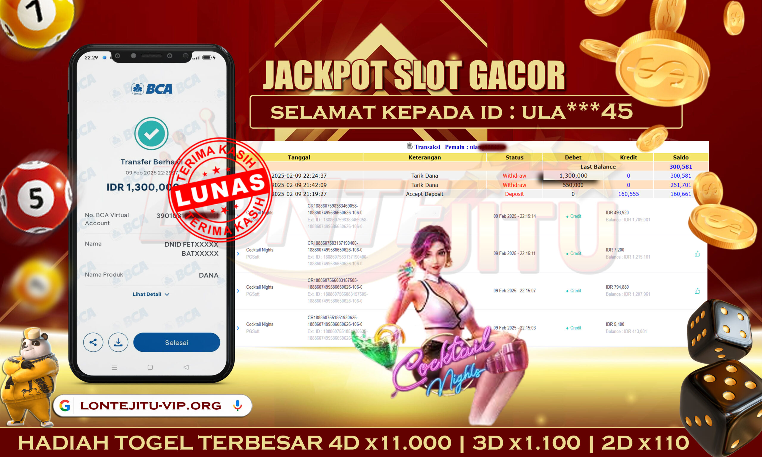 Bukti JP SLOT COCKTAIL NIGHTS – Namun, yang kami posting ini sah dan real tanpa merekayasa yah dan hanya bertujuan untuk meningkatkan kepercayaan para member kami dan memberikan kenyamanan saat melakukan taruhan di situs kami, Jadi bosku tidak perlu khawatir BERAPAPUN KEMENANGAN KALIAN PASTI DIBAYAR LUNAS !! . Teman – teman sekalian sudah daftar di LONTEJITU belum yah..?, Jika belum jangan tunggu lagi, ayo segera daftarkan dan mainkan game SLOT GACOR kami yang sedang ONFIRE ini bisa jadi saudara / saudara salahsatu orang beruntung yang akan JP PAUS berikutnya nih!!.