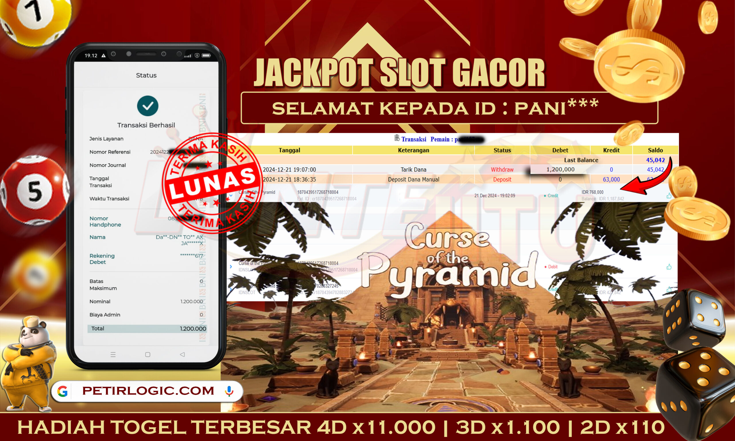 Bukti JP SLOT CURSE OF THE PYRAMID – Kami mengucapkan selamat kepada bossku Username ID PANI*** atas kemenangan di permainan SLOT CURSE OF THE PYRAMID dengan total kemenangan sebesar Rp. 1.200.000,00,- Kemenangan ini yang pastinya sudah dibayar LUNAS sesuai dengan bukti ya bossku. Lontejitu nih boss, berapapun kemenangan anda akan tetap kami bayar sampai tuntas ya boss.