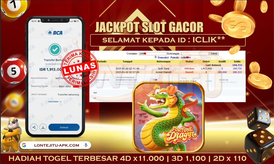 Bukti JP SLOT FORTUNE DRAGON – Kami mengucapkan selamat kepada bossku Username ID ICLIK** atas kemenangan di permainan SLOT FORTUNE DRAGON dengan total kemenangan sebesar Rp. 1.913.000,00,- Kemenangan ini yang pastinya sudah dibayar LUNAS sesuai dengan bukti ya bossku. Lontejitu nih boss, berapapun kemenangan anda akan tetap kami bayar sampai tuntas ya boss.