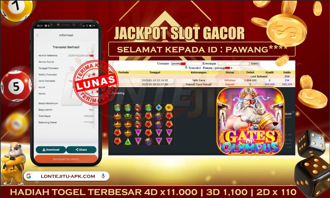 Bukti JP SLOT GATES OF OLYMPUS 1000 – Kami mengucapkan selamat kepada bossku Username ID PAWANG**** atas kemenangan di permainan SLOT GATES OF OLYMPUS 1000 dengan total kemenangan sebesar Rp. 2,994.000,00,- Kemenangan ini yang pastinya sudah dibayar LUNAS sesuai dengan bukti ya bossku. Lontejitu nih boss, berapapun kemenangan anda akan tetap kami bayar sampai tuntas ya boss.