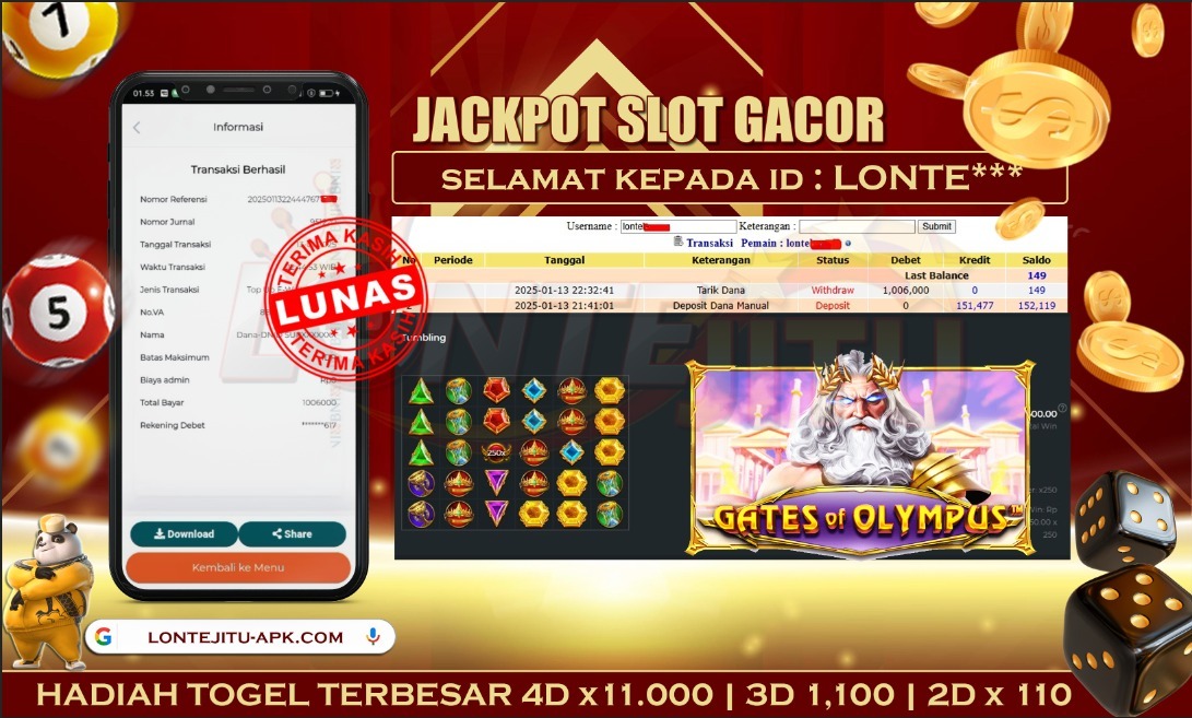 Bukti JP SLOT GATES OF OLYMPUS 1000 – Kami mengucapkan selamat kepada bossku Username ID LONTE*** atas kemenangan di permainan SLOT GATES OF OLYMPUS 1000 dengan total kemenangan sebesar Rp. 1,006.000,00,- Kemenangan ini yang pastinya sudah dibayar LUNAS sesuai dengan bukti ya bossku. Lontejitu nih boss, berapapun kemenangan anda akan tetap kami bayar sampai tuntas ya boss.