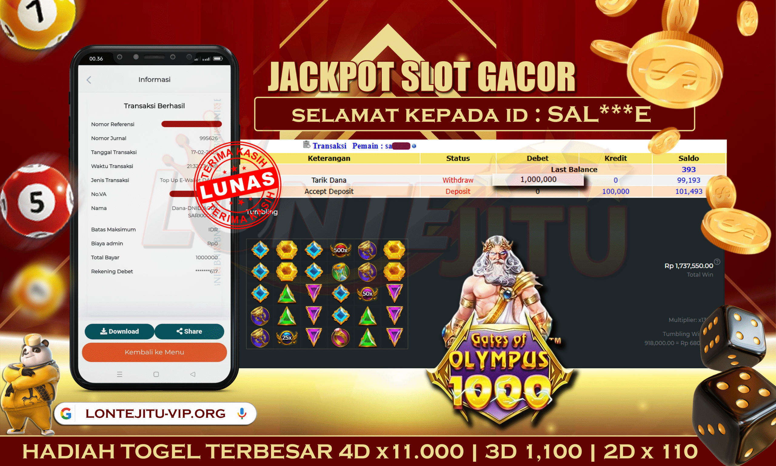 Bukti JP GATES OF OLYMPUS 1000 – Kami mengucapkan selamat kepada bossku Username ID SAL***E atas kemenangan di permainan SLOT GATES OF OLYMPUS 1000 dengan total kemenangan sebesar Rp.1.737.550,00,- Kemenangan ini yang pastinya sudah dibayar LUNAS sesuai dengan bukti ya bossku. Lontejitu nih boss, berapapun kemenangan anda akan tetap kami bayar sampai tuntas ya boss.