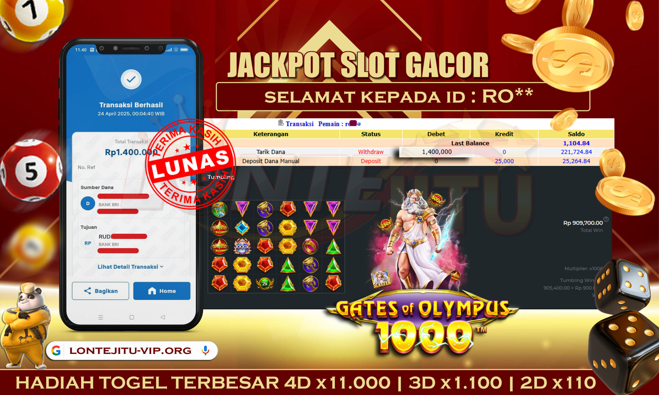 Bukti JP SLOT GATES OF OLYMPUS 1000 – Kami mengucapkan selamat kepada bossku Username ID RO** atas kemenangan di permainan SLOT GATES OF OLYMPUS 1000Â dengan total kemenangan sebesar Rp. 1.400.000,00,- Kemenangan ini yang pastinya sudah dibayar LUNAS sesuai dengan bukti ya bossku. Lontejitu nih boss, berapapun kemenangan anda akan tetap kami bayar sampai tuntas ya boss.Â