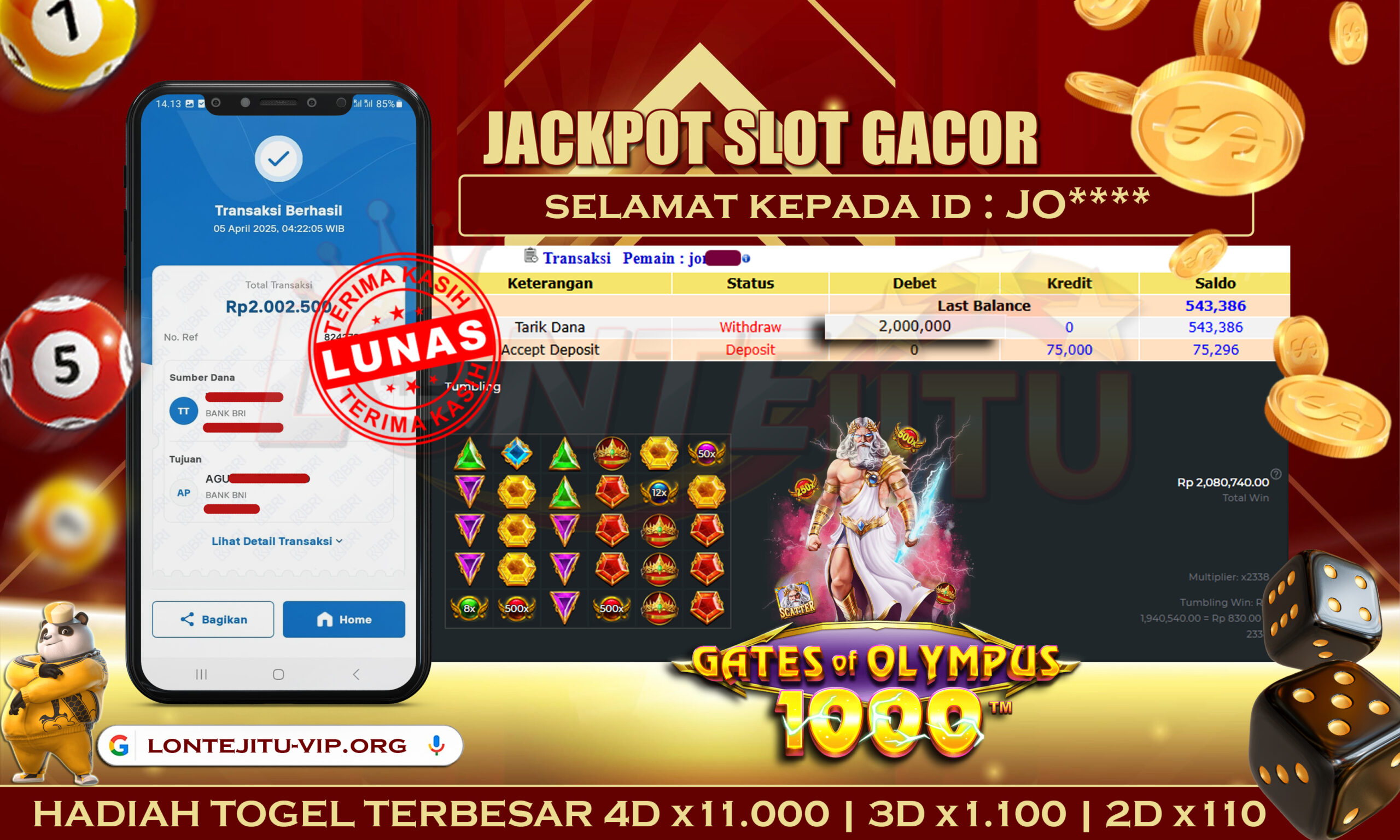 Bukti JP SLOT GATES OF OLYMPUS 1000 – Kami mengucapkan Selamat kepada bossku dengan Username ID JO**** atas kemenangannya di permainan SLOT GATES OF OLYMPUS 1000 dengan total kemenangan sebesar Rp.2.000.000,00,- Kemenangan ini yang pastinya sudah dibayar LUNAS sesuai dengan bukti ya bossku. Lontejitu nih boss, berapapun kemenangan anda akan tetap kami bayar sampai tuntas ya boss.