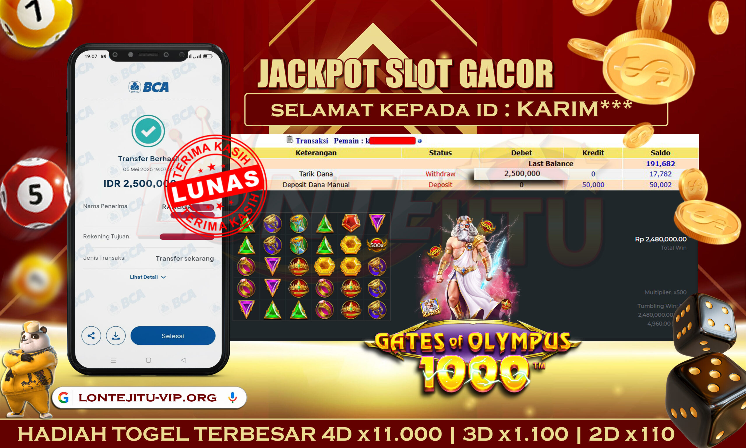 Bukti JP SLOT GATES OF OLYMPUS 1000 – Kami mengucapkan selamat kepada bossku Username ID KARIM*** atas kemenangan di permainan SLOT GATES OF OLYMPUS 1000 dengan total kemenangan sebesar Rp. 2,500.000,00,- Kemenangan ini yang pastinya sudah dibayar LUNAS sesuai dengan bukti ya bossku. Lontejitu nih boss, berapapun kemenangan anda akan tetap kami bayar sampai tuntas ya boss.