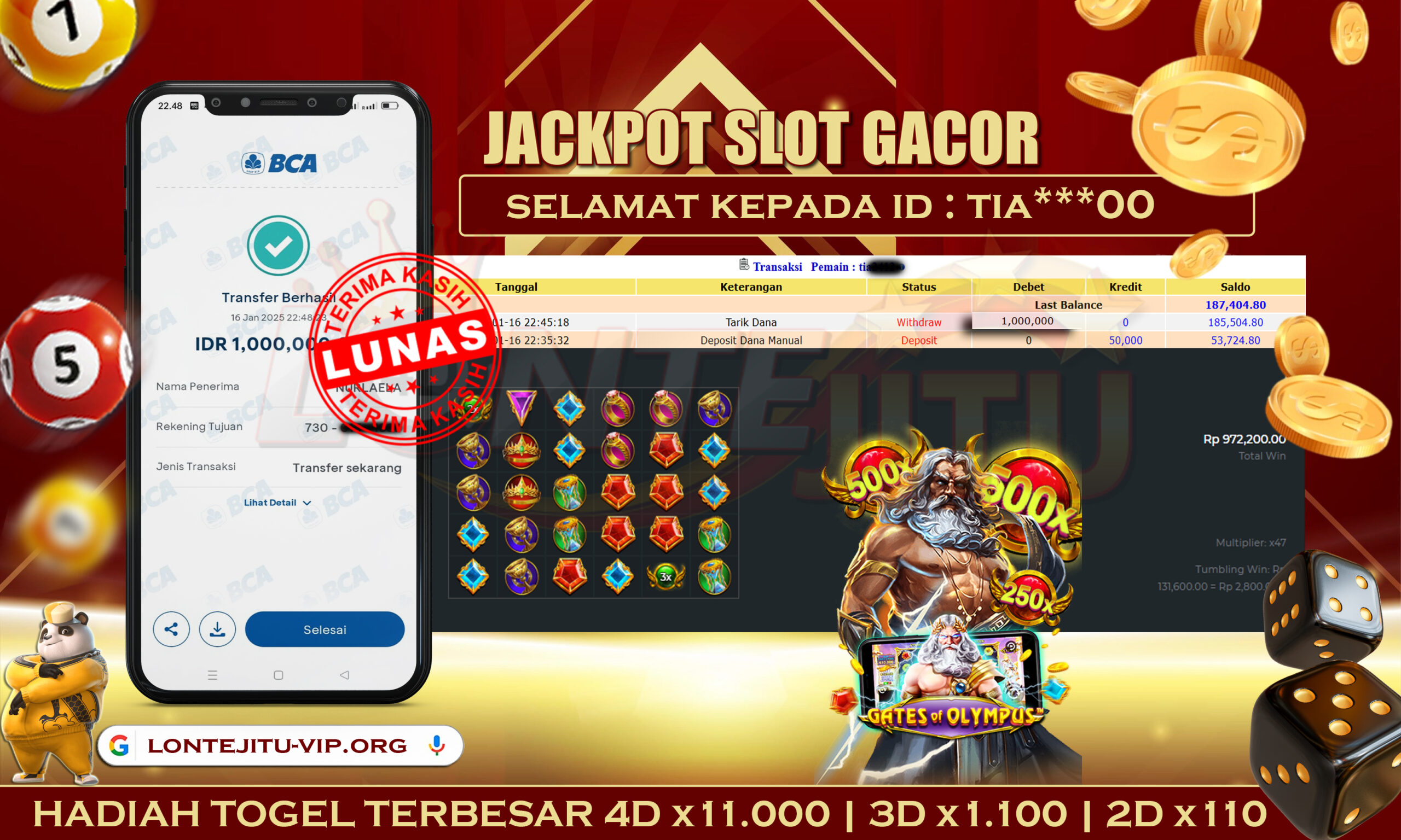 Bukti JP SLOT GATES OF OLYMPUS – Kami mengucapkan selamat kepada bossku Username ID TIA***00 atas kemenangan di permainan SLOT GATES OF OLYMPUS dengan total kemenangan sebesar Rp. 1,000.000,00,- Kemenangan ini yang pastinya sudah dibayar LUNAS sesuai dengan bukti ya bossku. Lontejitu nih boss, berapapun kemenangan anda akan tetap kami bayar sampai tuntas ya boss.