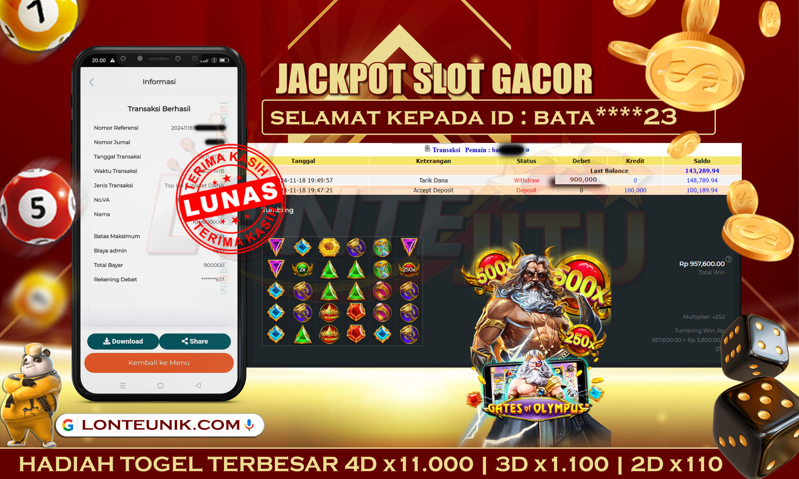 Bukti JP SLOT GATES OF OLYMPUS – Kami mengucapkan selamat kepada bossku Username ID BATA****23 atas kemenangan di permainan SLOT GATES OF OLYMPUS dengan total kemenangan sebesar Rp. 1.000.000,00,- Kemenangan ini yang pastinya sudah dibayar LUNAS sesuai dengan bukti ya bossku. Lontejitu nih boss, berapapun kemenangan anda akan tetap kami bayar sampai tuntas ya boss.