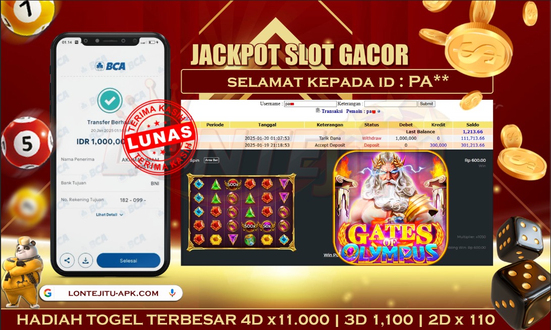 Bukti JP SLOT GATES OF OLYMPUS – Kami mengucapkan selamat kepada bossku Username ID PC** atas kemenangan di permainan SLOT GATES OF OLYMPUS dengan total kemenangan sebesar Rp. 1,000.000,00,- Kemenangan ini yang pastinya sudah dibayar LUNAS sesuai dengan bukti ya bossku. Lontejitu nih boss, berapapun kemenangan anda akan tetap kami bayar sampai tuntas ya boss.