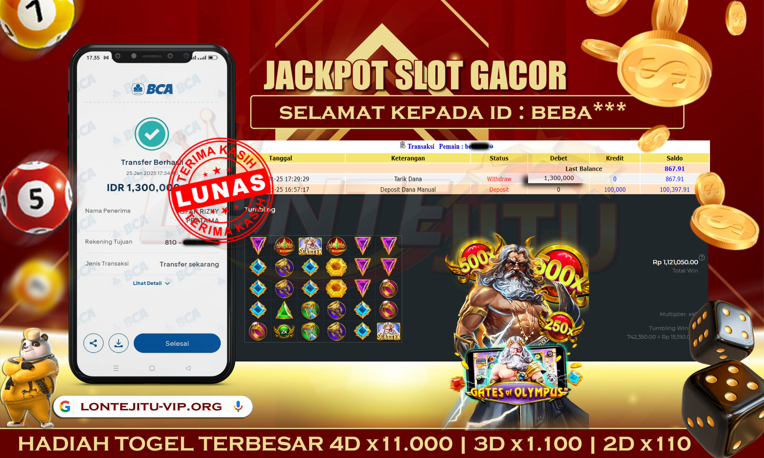 Bukti JP SLOT GATES OF OLYMPUS – Kami mengucapkan selamat kepada bossku Username ID BEBA*** atas kemenangan di permainan SLOT GATES OF OLYMPUS dengan total kemenangan sebesar Rp. 1,300.000,00,- Kemenangan ini yang pastinya sudah dibayar LUNAS sesuai dengan bukti ya bossku. Lontejitu nih boss, berapapun kemenangan anda akan tetap kami bayar sampai tuntas ya boss.
