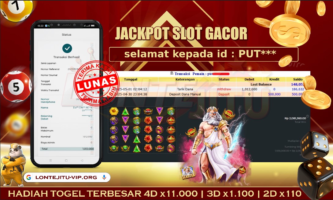 Bukti JP SLOT GATES OF OLYMPUS – Kami mengucapkan selamat kepada bossku Username ID PU*** atas kemenangan di permainan SLOT GATES OF OLYMPUS dengan total kemenangan sebesar Rp. 1.012.000,00,- Kemenangan ini yang pastinya sudah dibayar LUNAS sesuai dengan bukti ya bossku. Lontejitu nih boss, berapapun kemenangan anda akan tetap kami bayar sampai tuntas ya boss.
