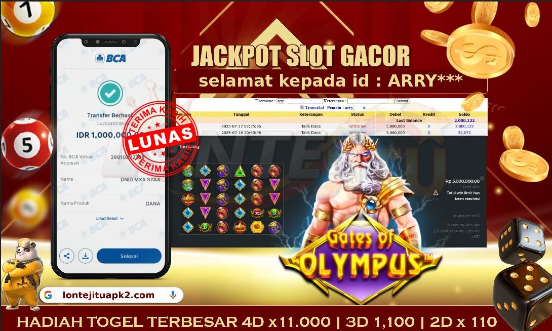 Bukti JP SLOT GATES OF OLYMPUS – Kami mengucapkan selamat kepada bossku Username ID ARRY***atas kemenangan di permainan SLOT GATES OF OLYMPUS dengan total kemenangan sebesar Rp.1,000.000,00,- Kemenangan ini yang pastinya sudah dibayar LUNAS sesuai dengan bukti ya bossku. Lontejitu nih boss, berapapun kemenangan anda akan tetap kami bayar sampai tuntas ya boss.