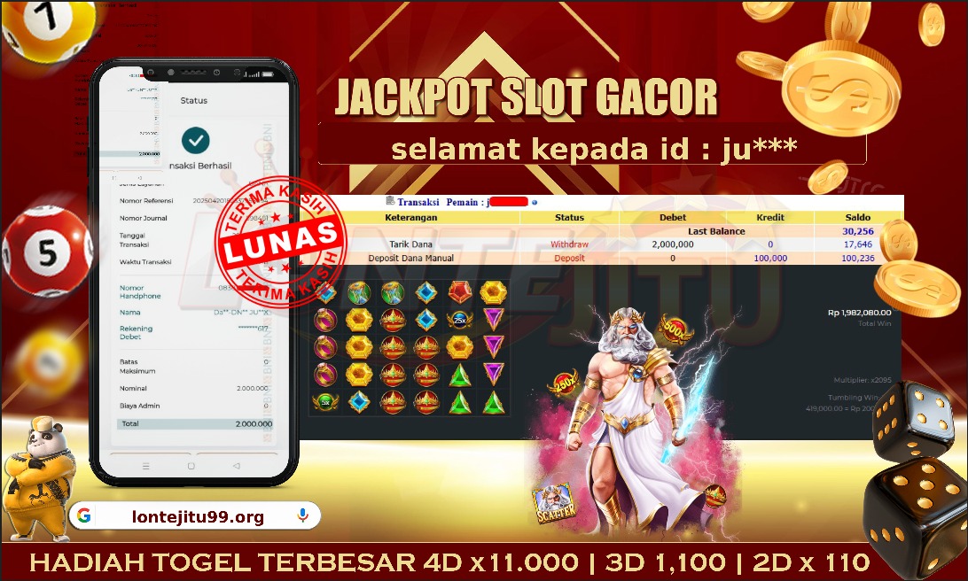 Bukti JP SLOT GATES OF OLYMPUS – Kami mengucapkan selamat kepada bossku Username ID JU**** atas kemenangan di permainan SLOT GATES OF OLYMPUS dengan total kemenangan sebesar Rp. 2.000.000,00,- Kemenangan ini yang pastinya sudah dibayar LUNAS sesuai dengan bukti ya bossku. Lontejitu nih boss, berapapun kemenangan anda akan tetap kami bayar sampai tuntas ya boss.