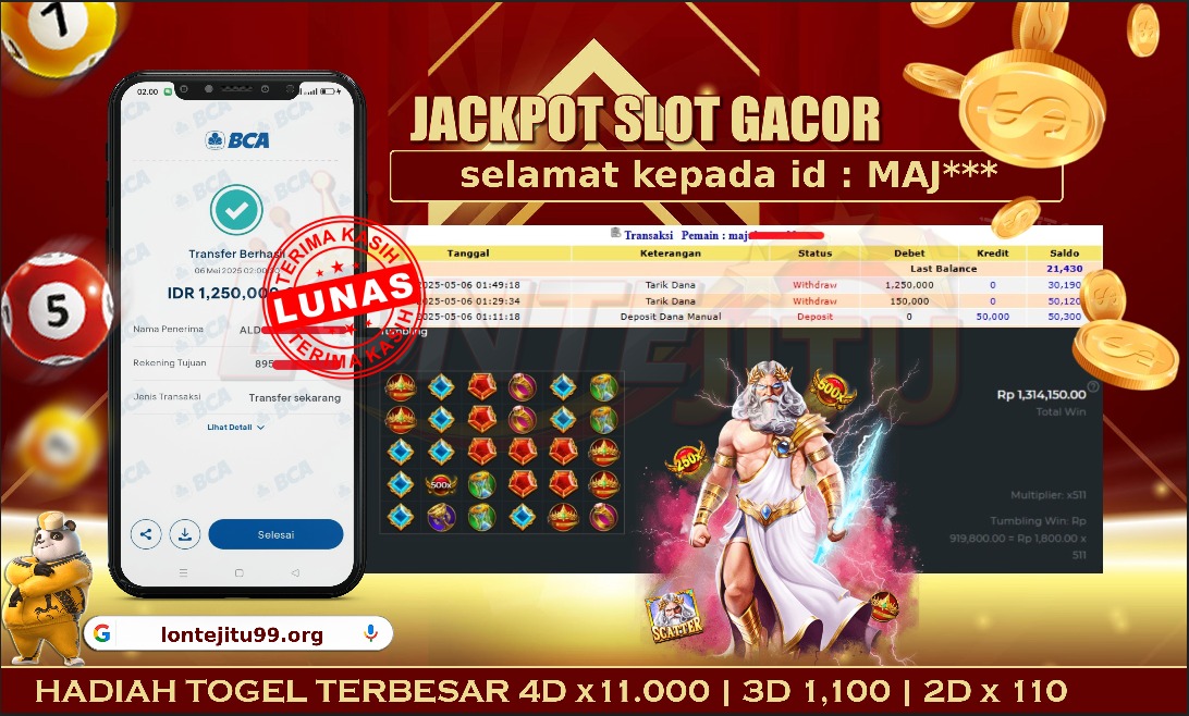 Bukti JP SLOT GATES OF OLYMPUS – Kami mengucapkan selamat kepada bossku Username ID MAJ*** atas kemenangan di permainan SLOT GATES OF OLYMPUS dengan total kemenangan sebesar Rp. 1.250.000,00,- Kemenangan ini yang pastinya sudah dibayar LUNAS sesuai dengan bukti ya bossku. Lontejitu nih boss, berapapun kemenangan anda akan tetap kami bayar sampai tuntas ya boss.