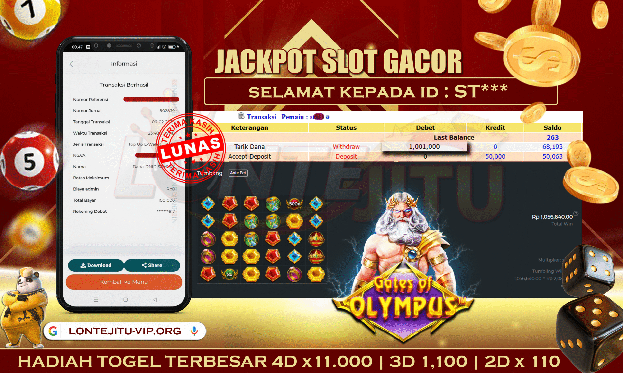 Bukti JP SLOT GATES OF OLYMPUS – Kami mengucapkan selamat kepada bossku Username ID ST*** atas kemenangan di permainan SLOT GATES OF OLYMPUS dengan total kemenangan sebesar Rp. 1.001.000,00,- Kemenangan ini yang pastinya sudah dibayar LUNAS sesuai dengan bukti ya bossku. Lontejitu nih boss, berapapun kemenangan anda akan tetap kami bayar sampai tuntas ya boss.