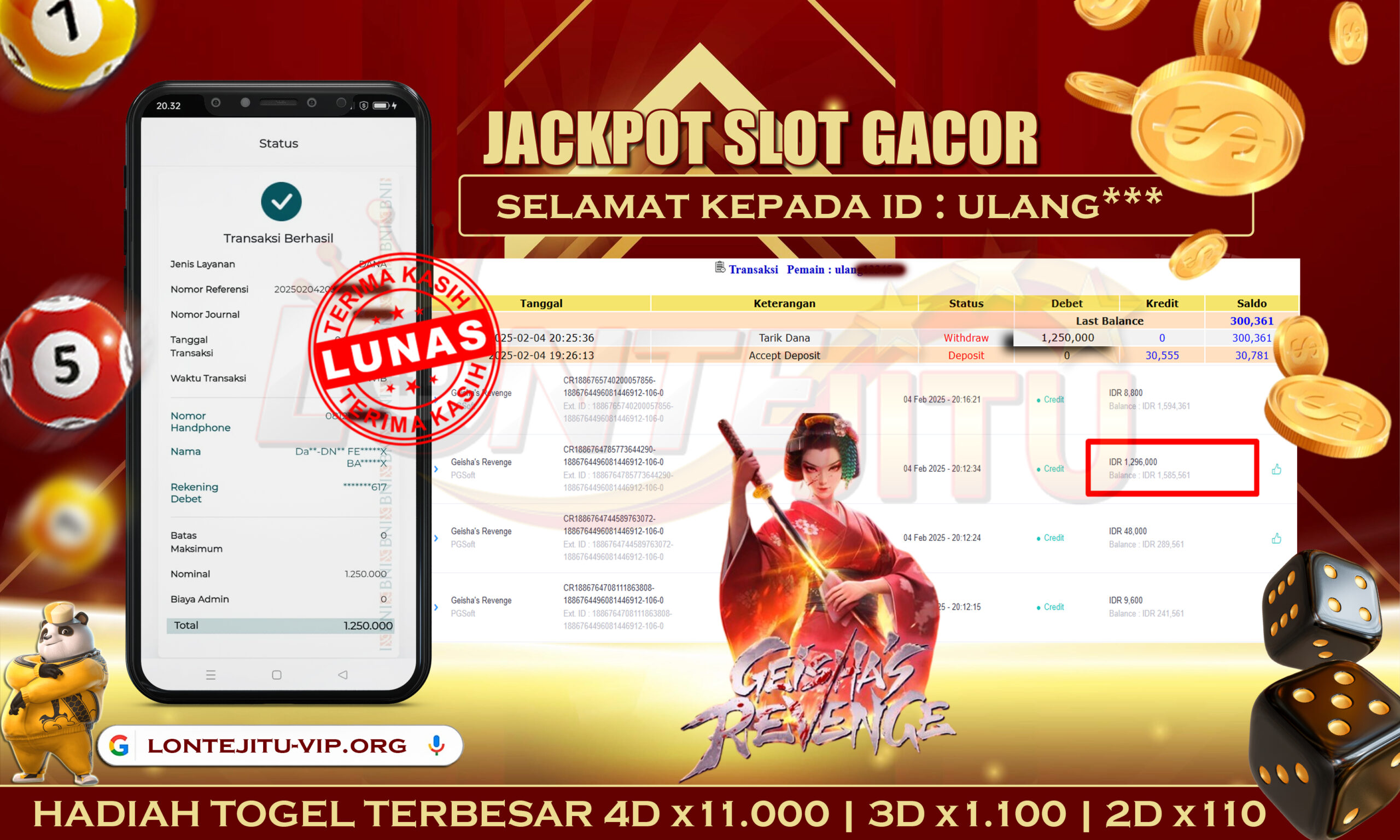 Bukti JP GEISHA’S REVENGE – Kami mengucapkan selamat kepada bossku Username ID ULANG*** atas kemenangan di permainan SLOT GEISHA’S REVENGE dengan total kemenangan sebesar Rp.1.550.000,00,- Kemenangan ini yang pastinya sudah dibayar LUNAS sesuai dengan bukti ya bossku. Lontejitu nih boss, berapapun kemenangan anda akan tetap kami bayar sampai tuntas ya boss.
