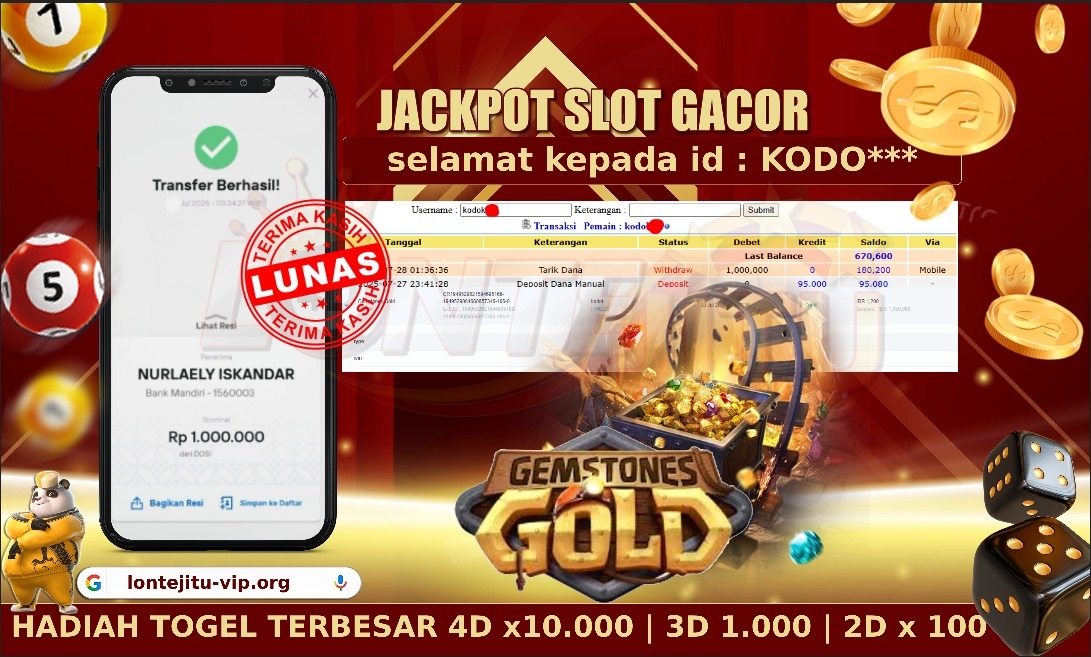 Bukti JP SLOT GEMSTONES GOLD – Kami mengucapkan selamat kepada bossku Username ID KODO*** atas kemenangan di permainan SLOT GEMSTONES GOLD dengan total kemenangan sebesar Rp.1,000.000,00,- Kemenangan ini yang pastinya sudah dibayar LUNAS sesuai dengan bukti ya bossku. Lontejitu nih boss, berapapun kemenangan anda akan tetap kami bayar sampai tuntas ya boss.