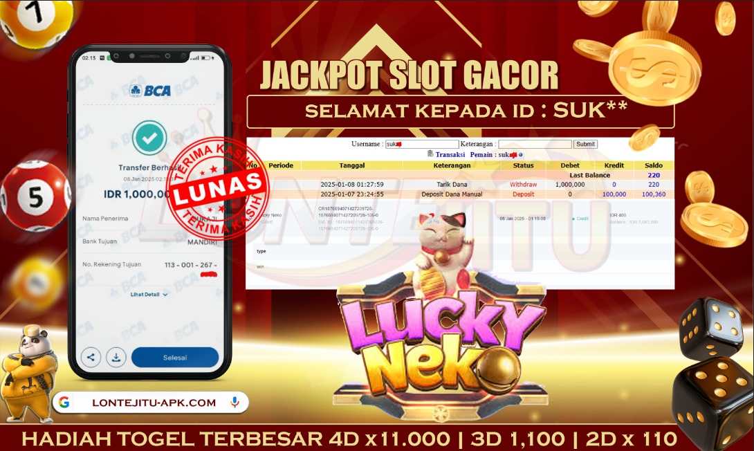 Bukti JP SLOT LUCKY NEKO – Kami mengucapkan selamat kepada bossku Username ID SUK** atas kemenangan di permainan SLOT GATES OF GATOT KACA dengan total kemenangan sebesar Rp. 1.000.000,00,- Kemenangan ini yang pastinya sudah dibayar LUNAS sesuai dengan bukti ya bossku. Lontejitu nih boss, berapapun kemenangan anda akan tetap kami bayar sampai tuntas ya boss.
