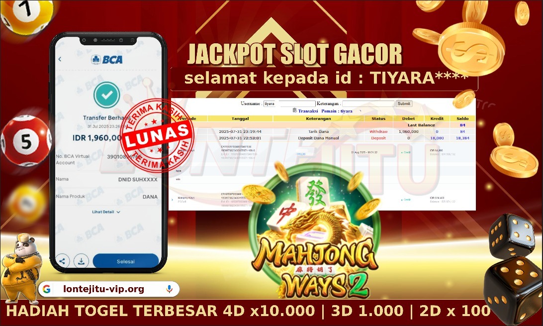 Disini kami mengucapkan Terimakasih telah mempercayakan LONTEJITU sebagai agent SLOT MAHJONG WAYS 2 online pilihan dalam bermain judi slot online. Semoga bossku bisa tetap bermain dengan aman, nyaman, dan terpercaya di agent online resmi kami ini. Jika bossku ada mendapatkan kendala bisa langsung menghungi Customer Service kami yang sudah tersedia di agent seperti Livechat, WhatsApp, dan Telegram yang stand by online 24 jam. Semoga kedepannya bossku bisa mendapatkan kemenangan yang lebih banyak lagi dan tentu saja tidak perlu khawatir akan pembayarannya. LONTEJITU merupakan agent togel dan slot yang terjamin aman dan dapat dipercayai, jackpot berapapun pasti akan kami bayar sampai LUNAS tanpa hambatan apapun ya bossku.