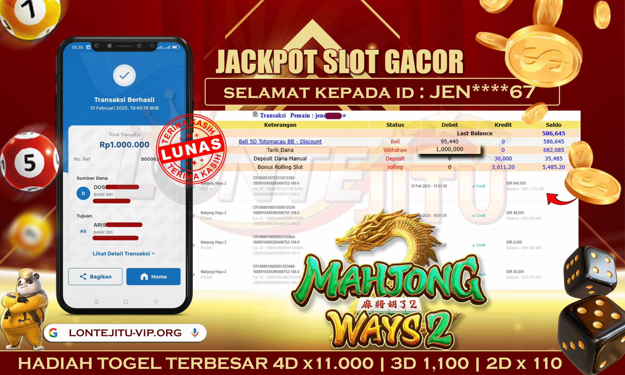 Bukti JP MAHJONG WAYS 2Â – Kami mengucapkan selamat kepada bossku Username ID JEN****67Â atas kemenangan di permainan SLOT MAHJONG WASY 2Â dengan total kemenangan sebesar Rp.1.000.000,00,- Kemenangan ini yang pastinya sudah dibayar LUNAS sesuai dengan bukti ya bossku. Lontejitu nih boss, berapapun kemenangan anda akan tetap kami bayar sampai tuntas ya boss.Â