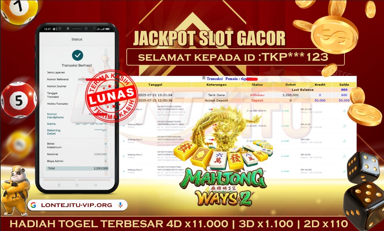 Bukti JP SLOT MAHJONG WAYS2 – Kami mengucapkan selamat kepada bossku Username ID TKP***123 atas kemenangan di permainan SLOT MAHJONG WAYS 2 dengan total kemenangan sebesar Rp.2.200.000,00,- Kemenangan ini yang pastinya sudah dibayar LUNAS sesuai dengan bukti ya bossku. Lontejitu nih boss, berapapun kemenangan anda akan tetap kami bayar sampai tuntas ya boss.