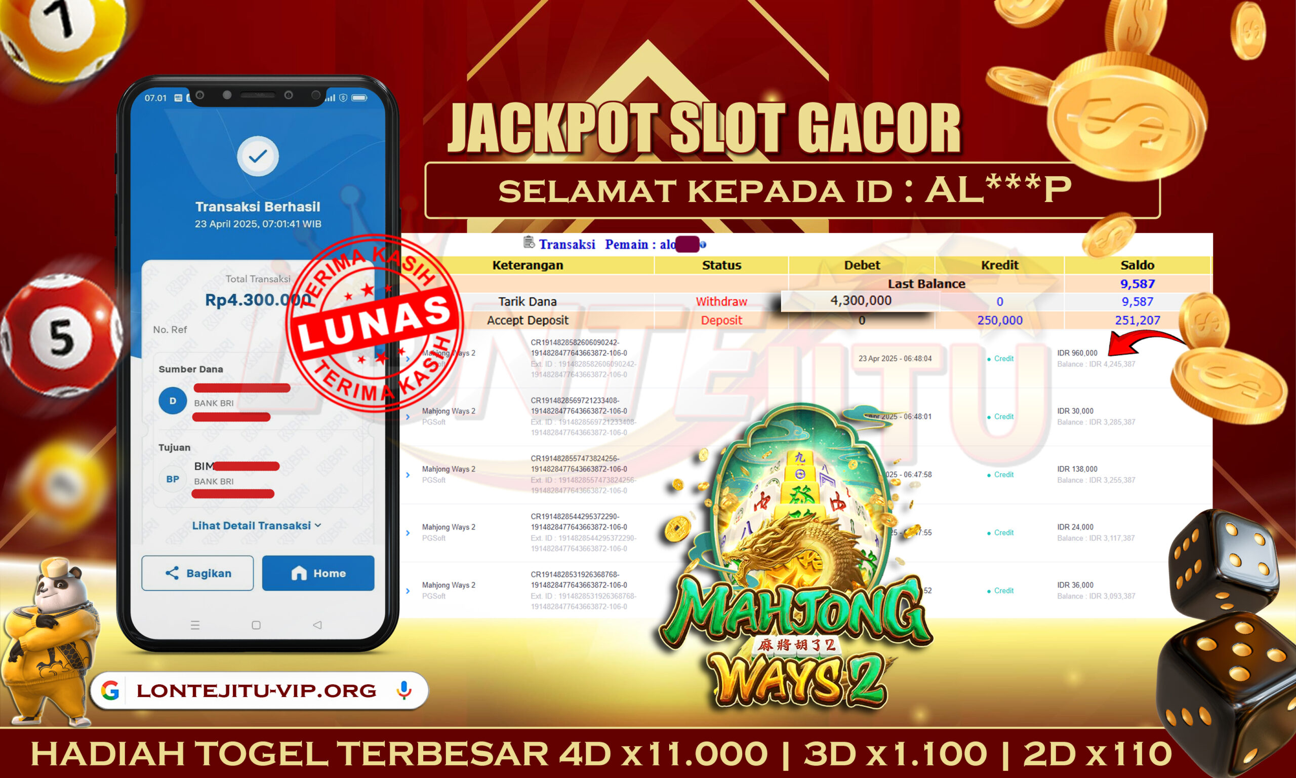 Bukti JP SLOT MAHJONG WAYS 2 – Kami mengucapkan selamat kepada bossku Username ID AL***P atas kemenangan di permainan SLOT MAHJONG WAYS 2 dengan total kemenangan sebesar Rp.4,300.000,00,- Kemenangan ini yang pastinya sudah dibayar LUNAS sesuai dengan bukti ya bossku. Lontejitu nih boss, berapapun kemenangan anda akan tetap kami bayar sampai tuntas ya boss.
