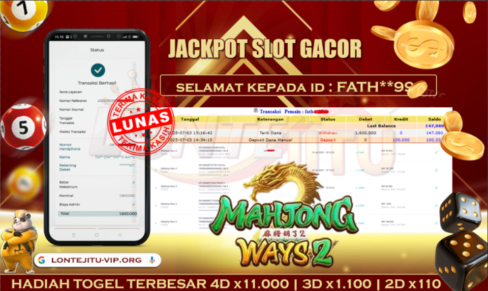 Bukti JP SLOT MAHJONG WAYS 2 – Kami mengucapkan selamat kepada bossku Username ID FATH***99 atas kemenangan di permainan SLOT MAHJONG WAYS 2 dengan total kemenangan sebesar Rp.1.600.000,00,- Kemenangan ini yang pastinya sudah dibayar LUNAS sesuai dengan bukti ya bossku. Lontejitu nih boss, berapapun kemenangan anda akan tetap kami bayar sampai tuntas ya boss.