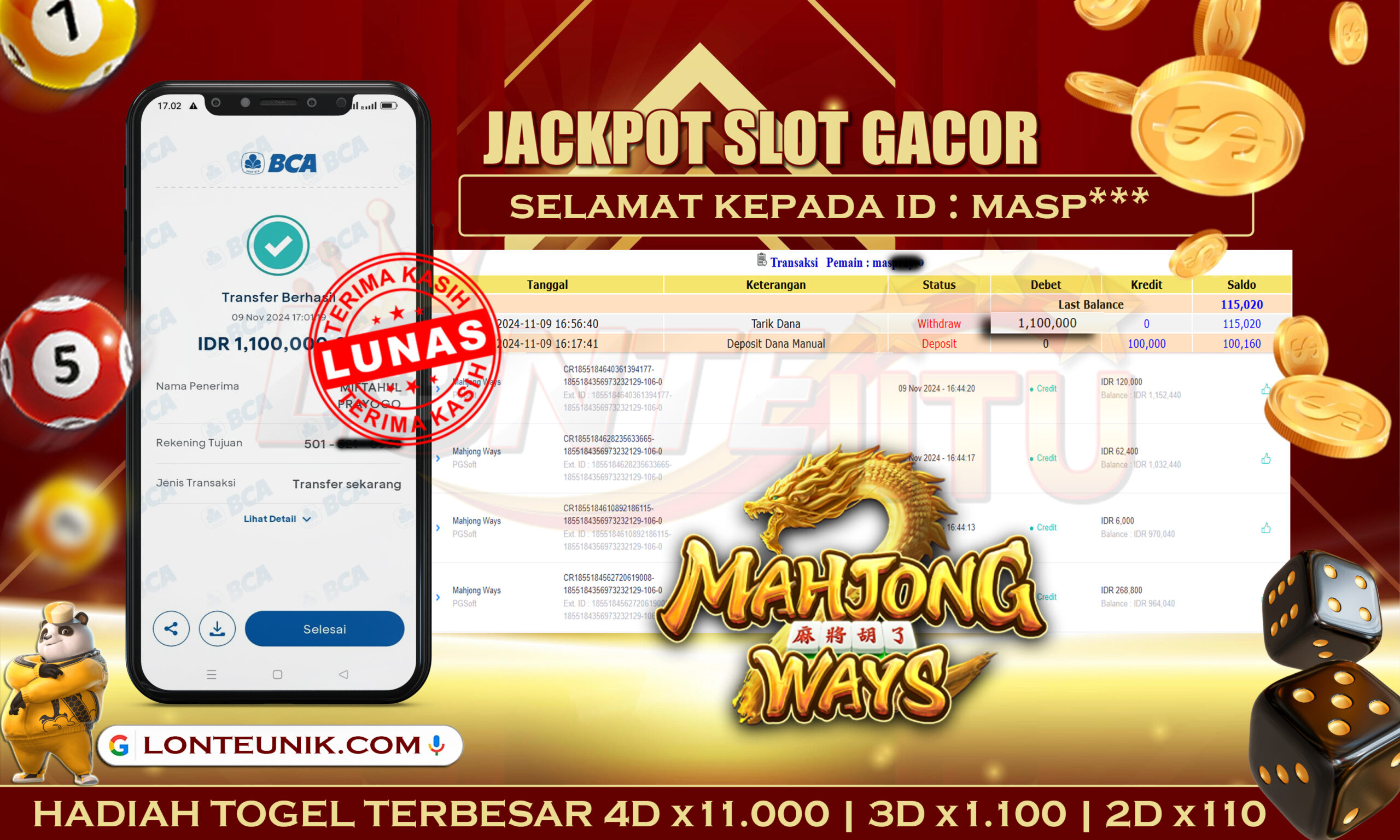 Bukti JP SLOT MAHJONG WAYS – Kami mengucapkan selamat kepada bossku Username ID MASP*** atas kemenangan di permainan SLOT MAHJONG WAYS dengan total kemenangan sebesar Rp. 1.100.000,00,- Kemenangan ini yang pastinya sudah dibayar LUNAS sesuai dengan bukti ya bossku. Lontejitu nih boss, berapapun kemenangan anda akan tetap kami bayar sampai tuntas ya boss.