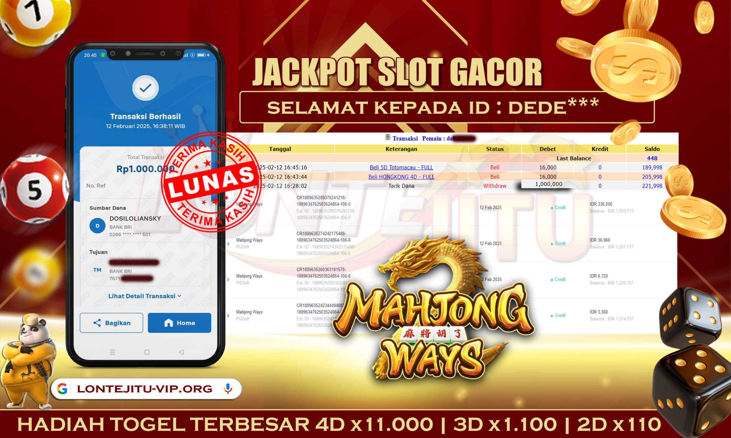 Bukti JP SLOT MAHJONG WAYS – Kami mengucapkan selamat kepada bossku Username ID DEDE*** atas kemenangan di permainan SLOT MAHJONG WAYS dengan total kemenangan sebesar Rp. 1.000.000,00,- Kemenangan ini yang pastinya sudah dibayar LUNAS sesuai dengan bukti ya bossku. Lontejitu nih boss, berapapun kemenangan anda akan tetap kami bayar sampai tuntas ya boss.