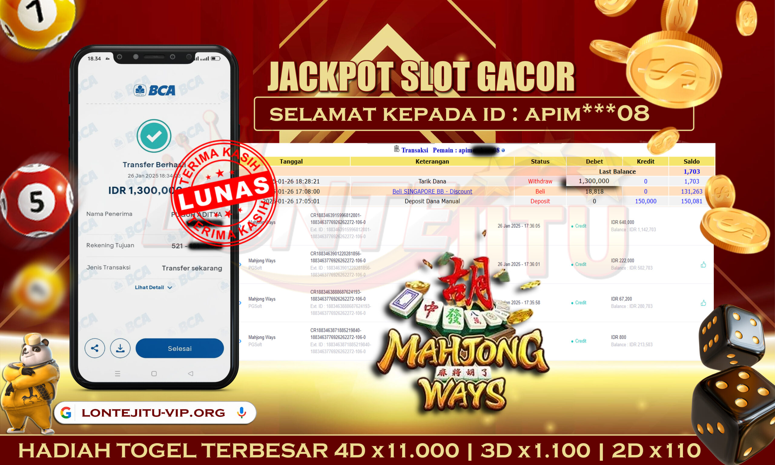 Bukti JP SLOT MAHJONG WAYS – Kami mengucapkan selamat kepada bossku Username ID APIM***08 atas kemenangan di permainan SLOT MAHJONG WAYS dengan total kemenangan sebesar Rp.1.300.000,00,- Kemenangan ini yang pastinya sudah dibayar LUNAS sesuai dengan bukti ya bossku. Lontejitu nih boss, berapapun kemenangan anda akan tetap kami bayar sampai tuntas ya boss.