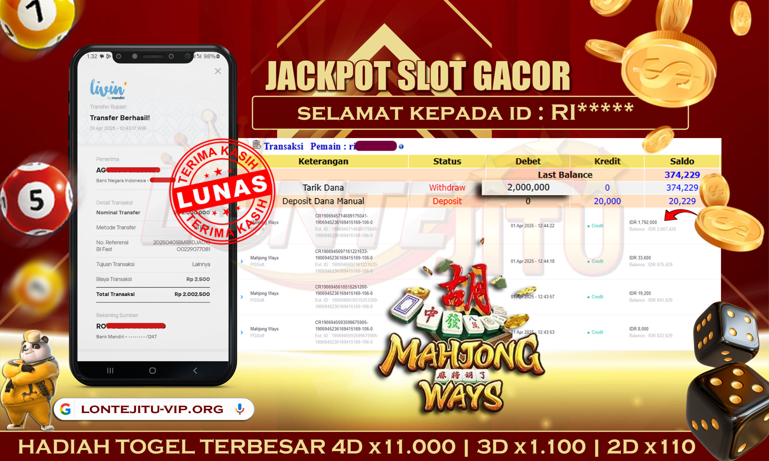 Bukti JP SLOT MAHJONG WAYS – Kami mengucapkan selamat kepada bossku Username ID RI***** atas kemenangan di permainan SLOT MAHJONG WAYS dengan total kemenangan sebesar Rp.2.000.000,00,- Kemenangan ini yang pastinya sudah dibayar LUNAS sesuai dengan bukti ya bossku. Lontejitu nih boss, berapapun kemenangan anda akan tetap kami bayar sampai tuntas ya boss.