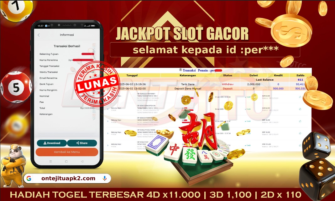 Bukti JP SLOT MAHJONG WAYS – Kami mengucapkan selamat kepada bossku Username ID per** atas kemenangan di permainan SLOT MAHJONG WAYS dengan total kemenangan sebesar Rp.2,000.000,00,- Kemenangan ini yang pastinya sudah dibayar LUNAS sesuai dengan bukti ya bossku. Lontejitu nih boss, berapapun kemenangan anda akan tetap kami bayar sampai tuntas ya boss.