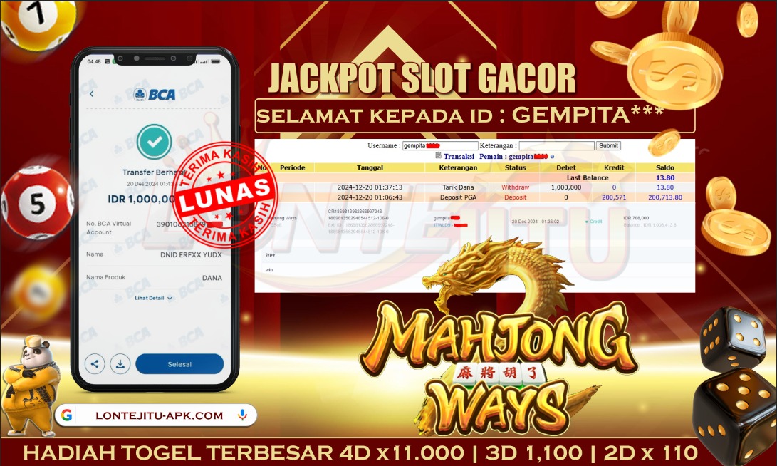 Bukti JP SLOT MAHJONG WAYS – Kami mengucapkan selamat kepada bossku Username ID GEMPITA*** atas kemenangan di permainan SLOT MAHJONG WAYS dengan total kemenangan sebesar Rp.1, 000.000,00,- Kemenangan ini yang pastinya sudah dibayar LUNAS sesuai dengan bukti ya bossku. Lontejitu nih boss, berapapun kemenangan anda akan tetap kami bayar sampai tuntas ya boss.