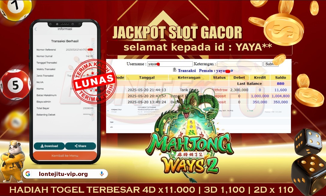 Bukti JP SLOT MAHJONG WAYS – Kami mengucapkan selamat kepada bossku Username ID YAYA** atas kemenangan di permainan SLOT MAHJONG WAYS dengan total kemenangan sebesar Rp.2,300.000,00,- Kemenangan ini yang pastinya sudah dibayar LUNAS sesuai dengan bukti ya bossku. Lontejitu nih boss, berapapun kemenangan anda akan tetap kami bayar sampai tuntas ya boss.