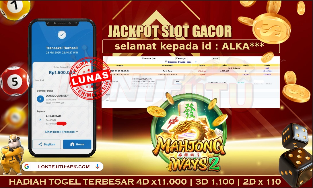 Disini kami mengucapkan Terimakasih telah mempercayakan LONTEJITU sebagai agent SLOT MAHJONG WAYS online pilihan dalam bermain judi slot online. Semoga bossku bisa tetap bermain dengan aman, nyaman, dan terpercaya di agent online resmi kami ini. Jika bossku ada mendapatkan kendala bisa langsung menghungi Customer Service kami yang sudah tersedia di agent seperti Livechat, WhatsApp, dan Telegram yang stand by online 24 jam. Semoga kedepannya bossku bisa mendapatkan kemenangan yang lebih banyak lagi dan tentu saja tidak perlu khawatir akan pembayarannya. LONTEJITU merupakan agent togel dan slot yang terjamin aman dan dapat dipercayai, jackpot berapapun pasti akan kami bayar sampai LUNAS tanpa hambatan apapun ya bossku.