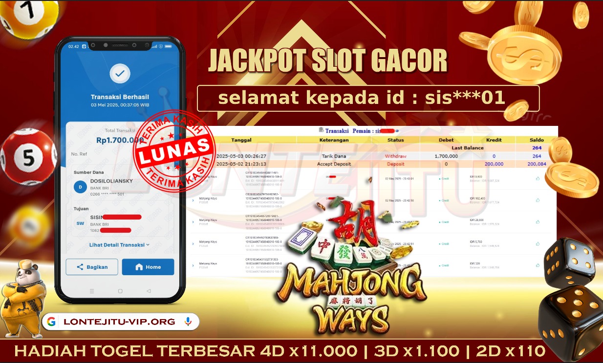 Bukti JP SLOT MAHJONG WAYS – Kami mengucapkan selamat kepada bossku Username ID SIS***01 atas kemenangan di permainan SLOT MAHJONG WAYS dengan total kemenangan sebesar Rp.1,700.000,00,- Kemenangan ini yang pastinya sudah dibayar LUNAS sesuai dengan bukti ya bossku. Lontejitu nih boss, berapapun kemenangan anda akan tetap kami bayar sampai tuntas ya boss.
