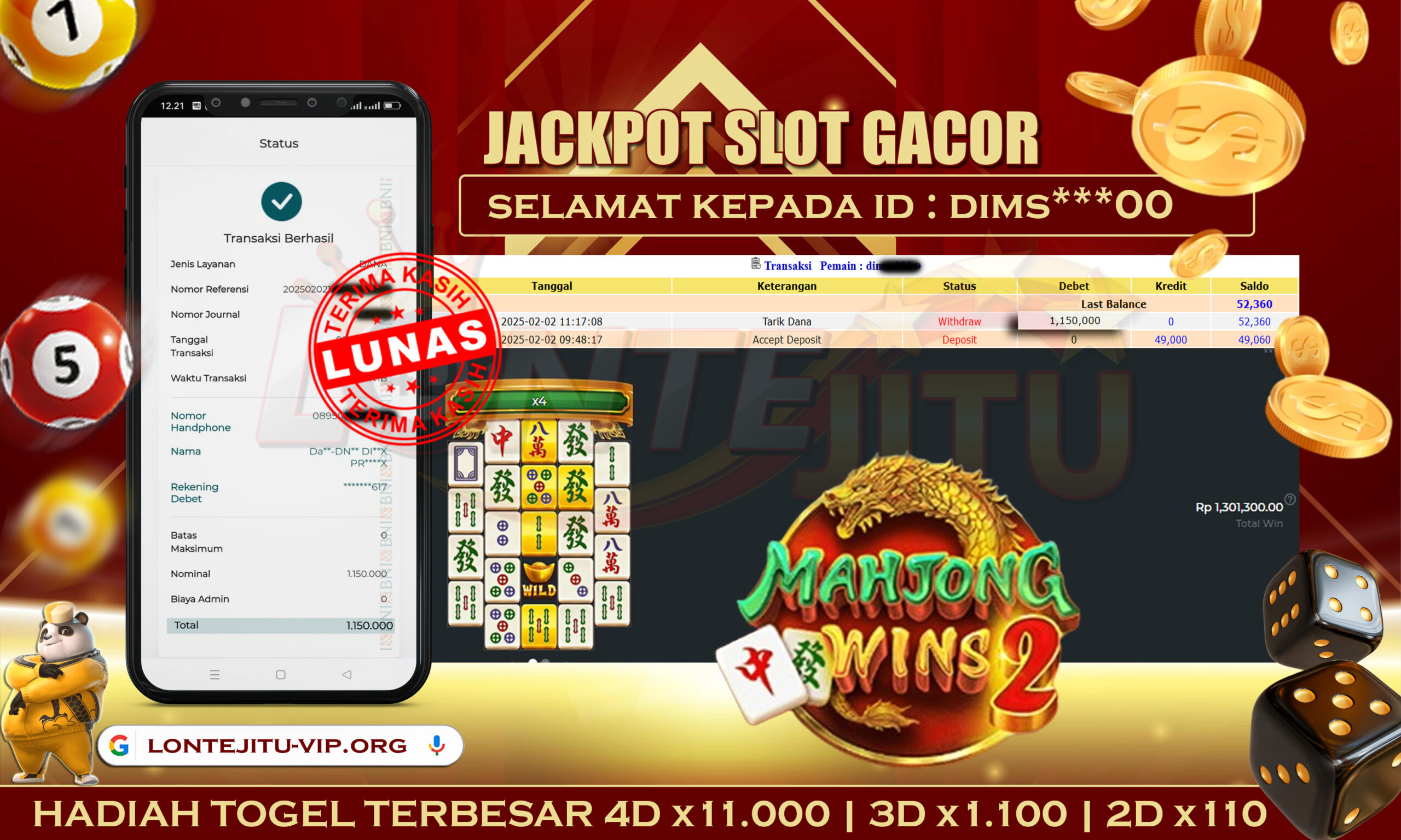 Bukti JP SLOT MAHJONG WINS 2 – Kami mengucapkan selamat kepada bossku Username ID DIMS***00 atas kemenangan di permainan SLOT MAHJONG WINS 2 dengan total kemenangan sebesar Rp.1.150.000,00,- Kemenangan ini yang pastinya sudah dibayar LUNAS sesuai dengan bukti ya bossku. Lontejitu nih boss, berapapun kemenangan anda akan tetap kami bayar sampai tuntas ya boss.