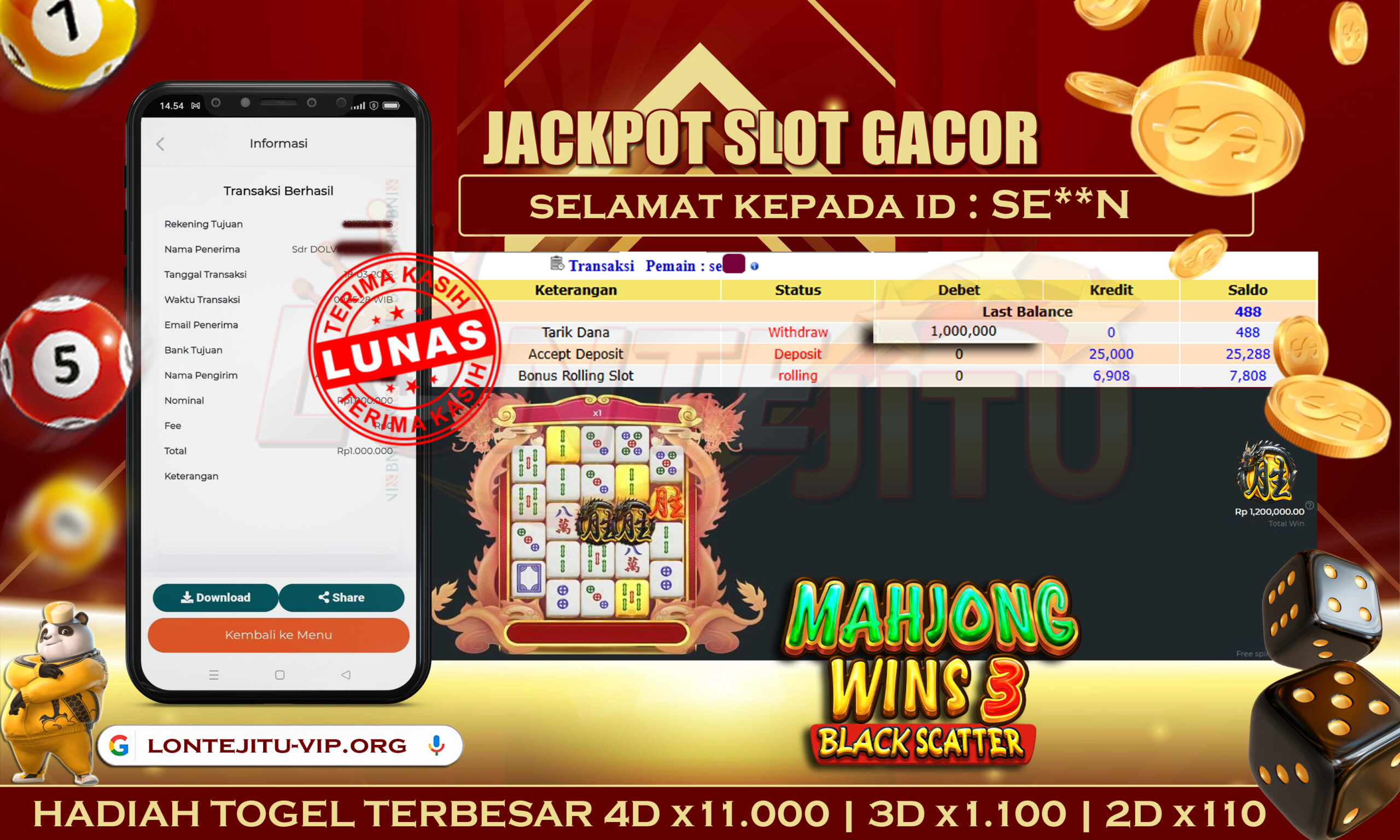 Bukti JP MAHJONG WINS 3 – Kami mengucapkan selamat kepada bossku Username ID SE**N atas kemenangan di permainan SLOT MAHJONG WINS 3 dengan total kemenangan sebesar Rp.1.000.000,00,- Kemenangan ini yang pastinya sudah dibayar LUNAS sesuai dengan bukti ya bossku. Lontejitu nih boss, berapapun kemenangan anda akan tetap kami bayar sampai tuntas ya boss.