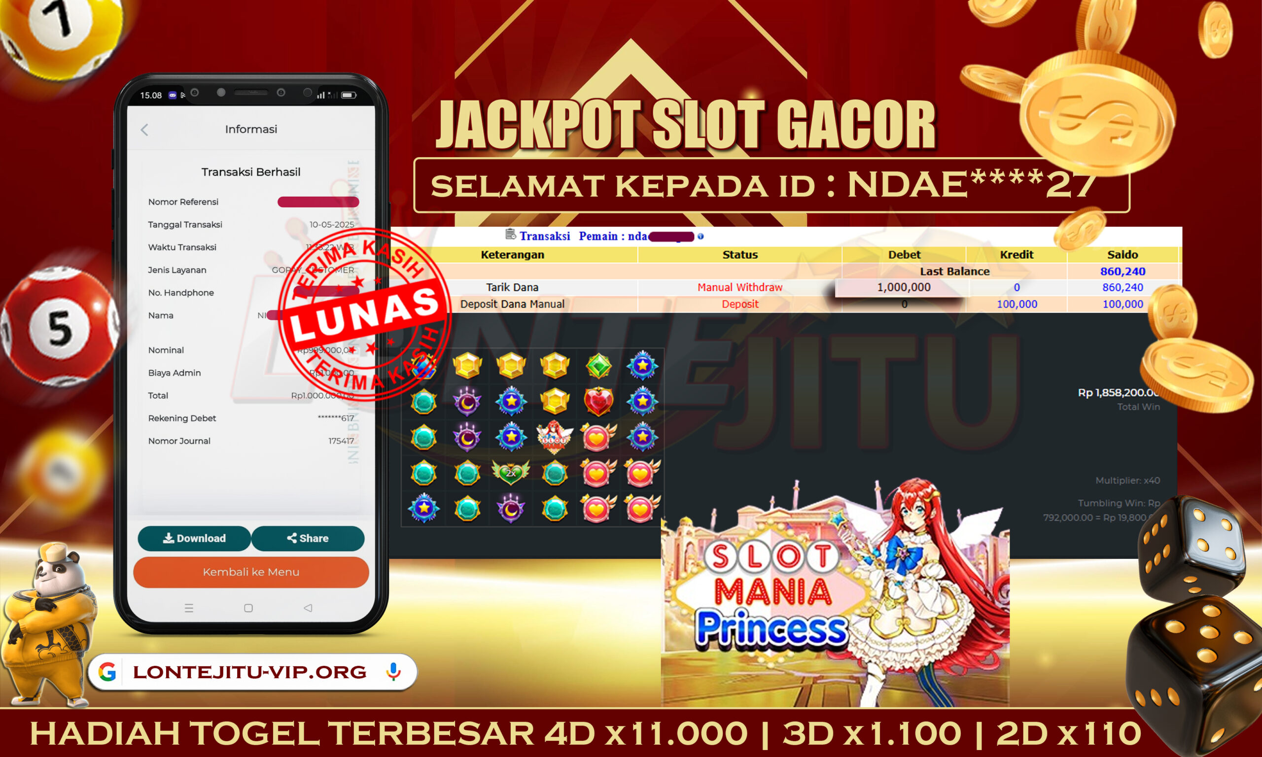 Bukti JP SLOT MANIA PRINCESS – Namun, yang kami posting ini sah dan real tanpa merekayasa yah dan hanya bertujuan untuk meningkatkan kepercayaan para member kami dan memberikan kenyamanan saat melakukan taruhan di situs kami, Jadi bosku tidak perlu khawatir BERAPAPUN KEMENANGAN KALIAN PASTI DIBAYAR LUNAS !! . Teman – teman sekalian sudah daftar di LONTEJITU belum yah..?, Jika belum jangan tunggu lagi, ayo segera daftarkan dan mainkan game SLOT GACOR kami yang sedang ONFIRE ini bisa jadi saudara / saudara salahsatu orang beruntung yang akan JP PAUS berikutnya nih!!.