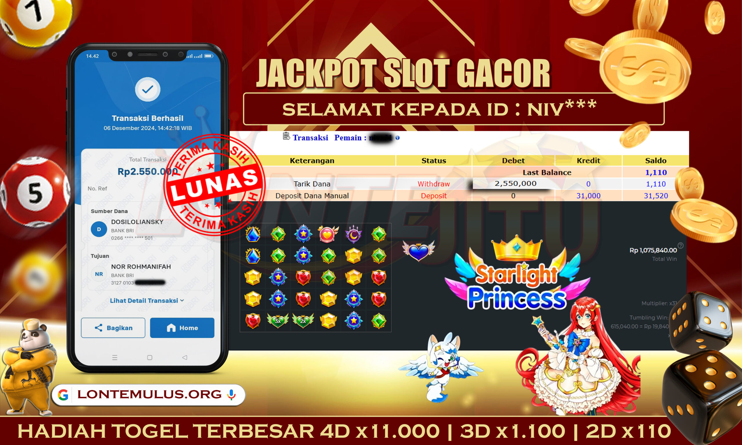 Bukti JP SLOT STARLIGHT PRINCESS – Kami mengucapkan selamat kepada bossku Username ID NIV**** atas kemenangan di permainan SLOT STARLIGHT PRINCESS dengan total kemenangan sebesar Rp. 2.550.000,00,- Kemenangan ini yang pastinya sudah dibayar LUNAS sesuai dengan bukti ya bossku. Lontejitu nih boss, berapapun kemenangan anda akan tetap kami bayar sampai tuntas ya boss.