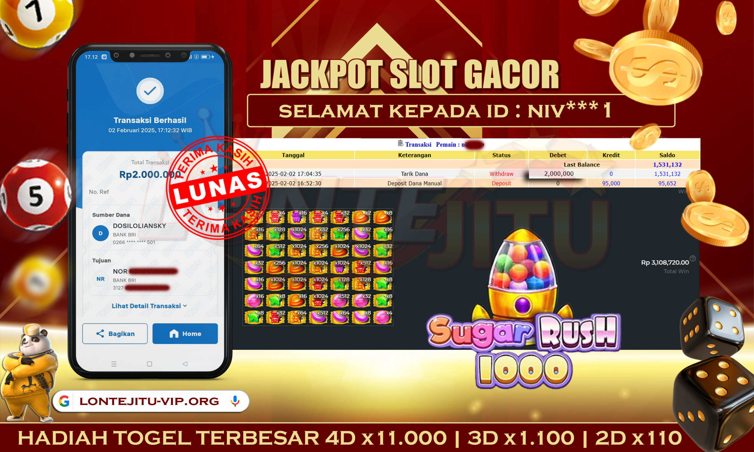 Bukti JP SLOT SUGAR RUSH 1000 – Namun, yang kami posting ini sah dan real tanpa merekayasa yah dan hanya bertujuan untuk meningkatkan kepercayaan para member kami dan memberikan kenyamanan saat melakukan taruhan di situs kami, Jadi bosku tidak perlu khawatir BERAPAPUN KEMENANGAN KALIAN PASTI DIBAYAR LUNAS !! . Teman – teman sekalian sudah daftar di LONTEJITU belum yah..?, Jika belum jangan tunggu lagi, ayo segera daftarkan dan mainkan game SLOT GACOR kami yang sedang ONFIRE ini bisa jadi saudara / saudara salahsatu orang beruntung yang akan JP PAUS berikutnya nih!!.