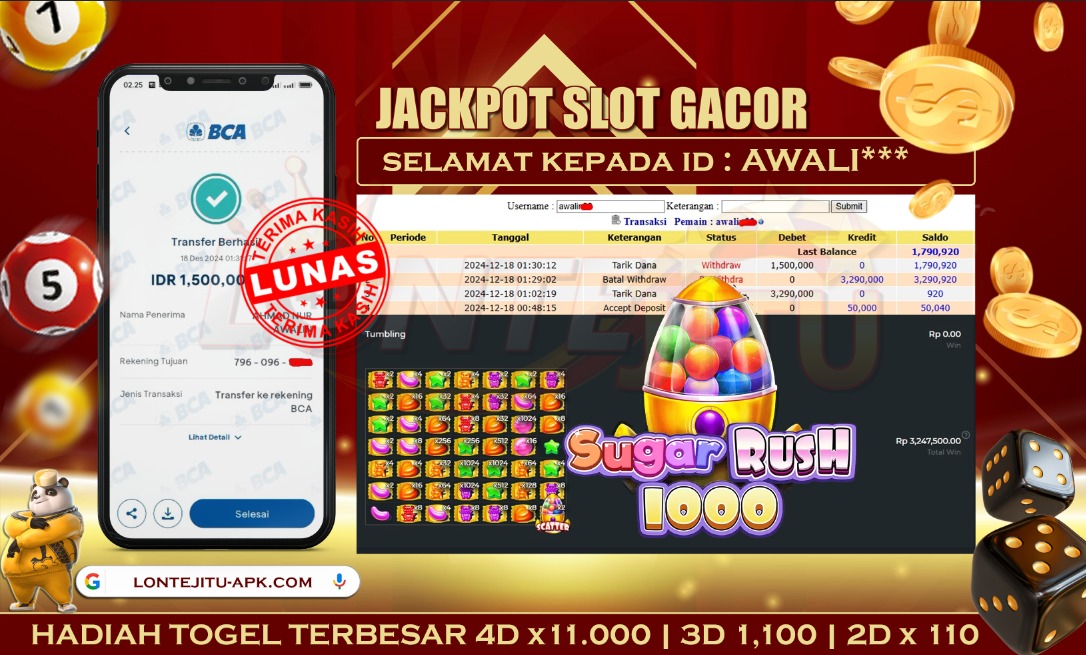 Bukti JP SLOT SUGAR RUSH 1000 – Namun, yang kami posting ini sah dan real tanpa merekayasa yah dan hanya bertujuan untuk meningkatkan kepercayaan para member kami dan memberikan kenyamanan saat melakukan taruhan di situs kami, Jadi bosku tidak perlu khawatir BERAPAPUN KEMENANGAN KALIAN PASTI DIBAYAR LUNAS !! . Teman – teman sekalian sudah daftar di LONTEJITU belum yah..?, Jika belum jangan tunggu lagi, ayo segera daftarkan dan mainkan game SLOT GACOR kami yang sedang ONFIRE ini bisa jadi saudara / saudara salahsatu orang beruntung yang akan JP PAUS berikutnya nih!!.