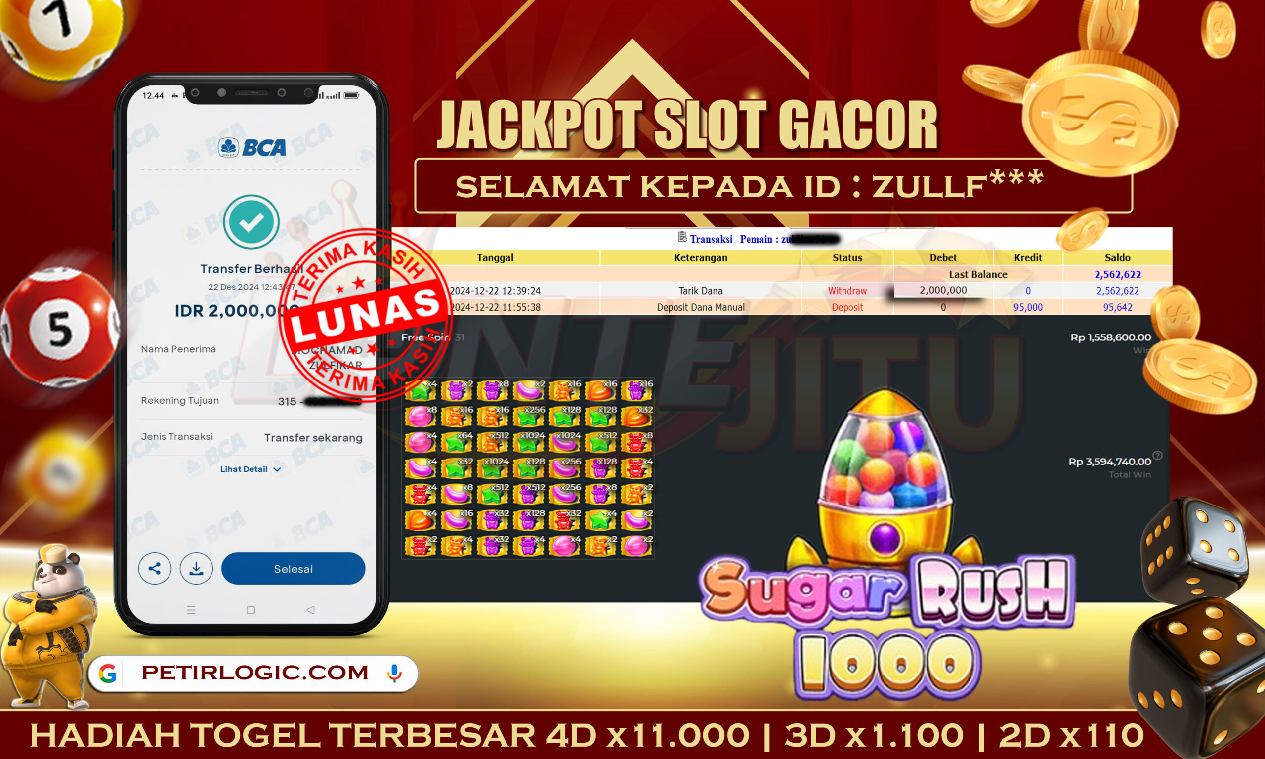 Bukti JP SLOT SUGAR RUSH 1000 – Kami mengucapkan selamat kepada bossku Username ID ZULLF*** atas kemenangan di permainan SLOT SUGAR RUSH 1000 dengan total kemenangan sebesar Rp. 4.500.000,00,- Kemenangan ini yang pastinya sudah dibayar LUNAS sesuai dengan bukti ya bossku. Lontejitu nih boss, berapapun kemenangan anda akan tetap kami bayar sampai tuntas ya boss.
